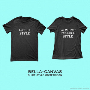 The Unisex style has straight sides that are more loose and not fitted while having a longer length. The Women’s Relaxed style has a slightly relaxed fit for comfort while still having a fitted shape, and it has a shorter length. Here’s a comparison photo of a small Unisex style and a small Women’s Relaxed style for comparison. (For reference, both are from the Bella+Canvas line of shirts if you’re familiar with that.)